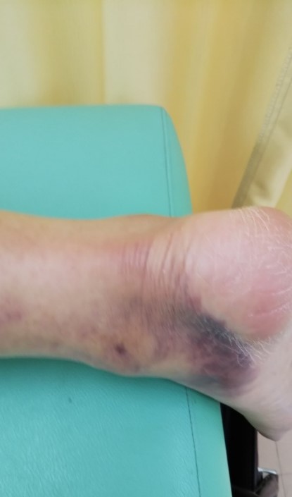 下腿部ですが、だんだんと内出血が下に下がり、足関節まで下がっているのが