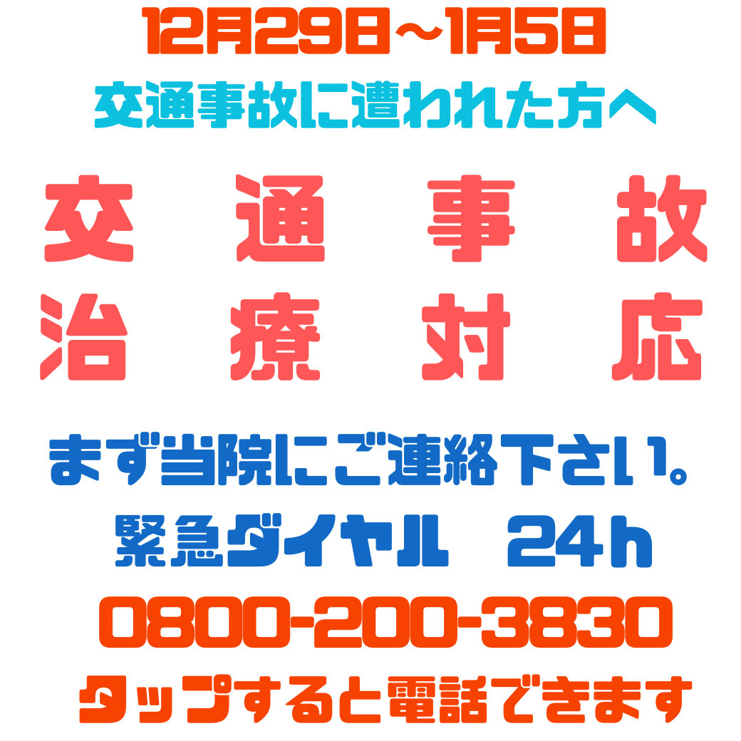 交通事故治療:年末年始行っています!!! お知らせ 2024年12月28日 12月29日~1月5日までお休みとなります。 年末年始で、交通事故に遭われた方は、当院で施術を受けることが出来ますので、 年末年始に関係なく当院にご連絡下さい。 病院は、休診になっていますので、当院で治療を受けることが出来ます。 保険会社に伝えてなくても大丈夫ですので、一度ご連絡下さい。 緊急連絡先:0800-200-3830 当院直通電話となります。 交通事故治療専門ページを見る。 たけうち接骨院専門ホームページ PR